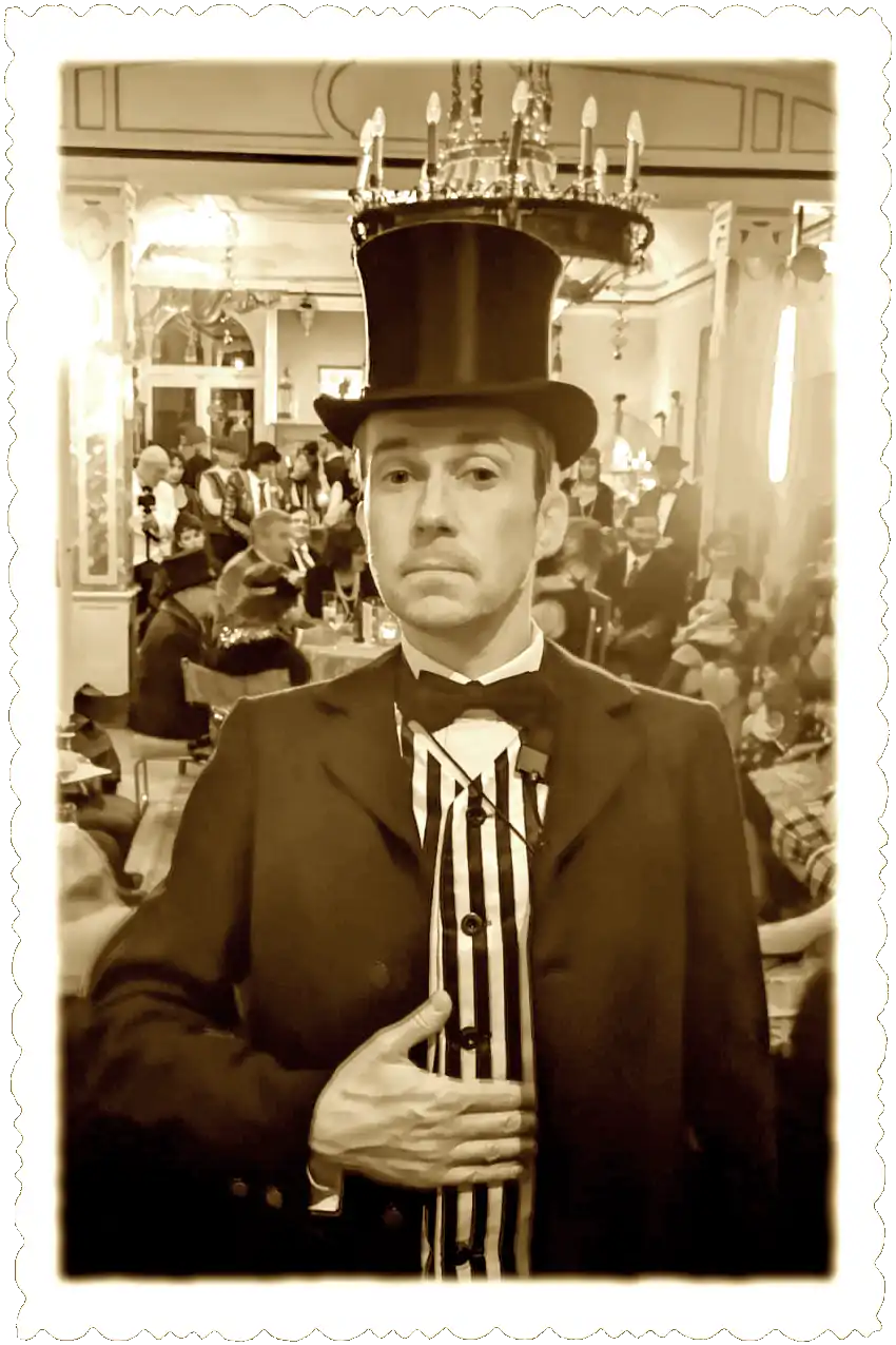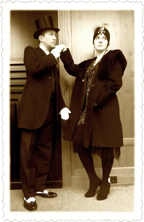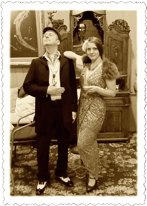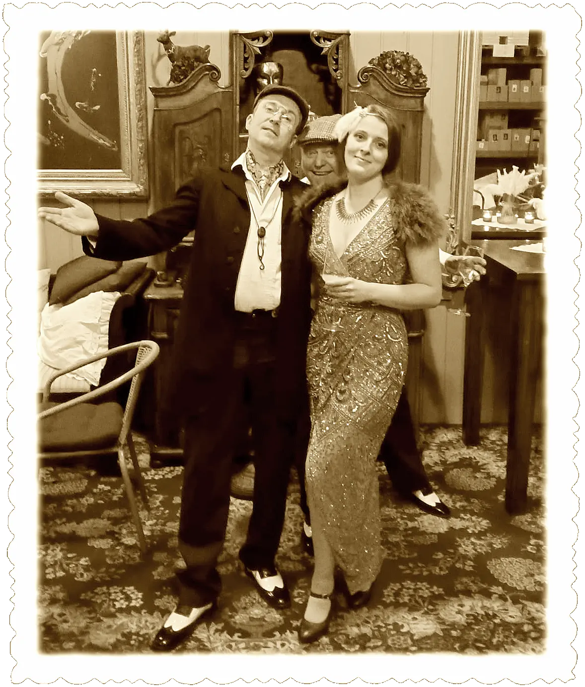 Hochverehrtes Publikum! Gehen Sie mit uns auf musikalische Zeitreise zurück in die goldenen 1920er Jahre, in die Zeit der Prohibition mit Fransenkleidchen und Absinth, Federboas, geknöpften Hosenträgern, Fliege, Zwickel und Zylinder! Wir entführen Sie in die "gute alte Zeit" der deutschen Gassenhauer - frisch - frech - frivol - fröhlich - beschwingt - nostalgisch - anzüglich - aber stets niveauvoll und authentisch interpretiert, wie einst von den Comedian Harmonists und auch heute noch z.B. von Max Raabe. Wir garantieren allerbeste Unterhaltung mit viel Wortwitz und Spaß in jeder Altersgruppe. Hören Sie Alltagsschlager unvergessener Stars wie Marlene Dietrich oder Zarah Leander, tanzen Sie zu heißem Charleston und Swing, lauschen Sie humorvollen Kabarettstückchen in charmanter Präsentation. Wir garantieren allerbeste Unterhaltung mit viel Wortwitz und Spaß in jeder Altersgruppe! Mit einst populärer Unterhaltungsmusik, Filmschlagern und Tanzmusik aus den "goldenen" 1920ern in vorwiegend deutscher Sprache unterhalten und entführen wir unser Publikum stilvoll in dieses faszinierende Zeitalter vergangener Tage, welches zudem herzlich zum Mitsingen und Mitmachen eingeladen ist. Folgen Sie uns auf eine Reise in die prickelnden "Roaring Twenties" voller Glanz und Glamour!